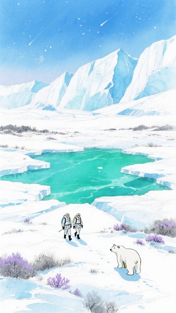 水彩风插画,清透梦幻的极地雪原,静谧中透出虚幻自然之美,探险者与北极熊相遇,星夜下共绘冬日童话。