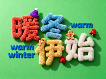 毛绒质感3D字体搭配圣诞元素,软萌可爱,温暖冬日主题,拼贴风设计,节日氛围浓厚。