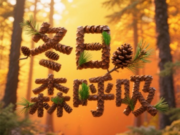 3D木雕风字体,松果与松针巧妙拼接,重拟物质感呈现冬日森林静谧之美,清新质朴中透出自然呼吸的温暖气息。