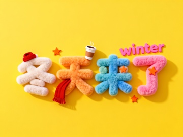 软3D毛绒字体搭配冬季元素,可爱卡通风格,温暖趣味十足,黄色背景衬托温馨节日氛围。