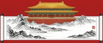 国潮风插画,鎏金浮雕质感,红金主调彰显中式奢华与喜庆,古典宫殿与山水相映,梦幻刺绣纹理点缀,尽显节日祥瑞之气。