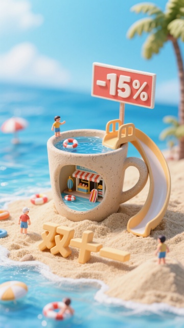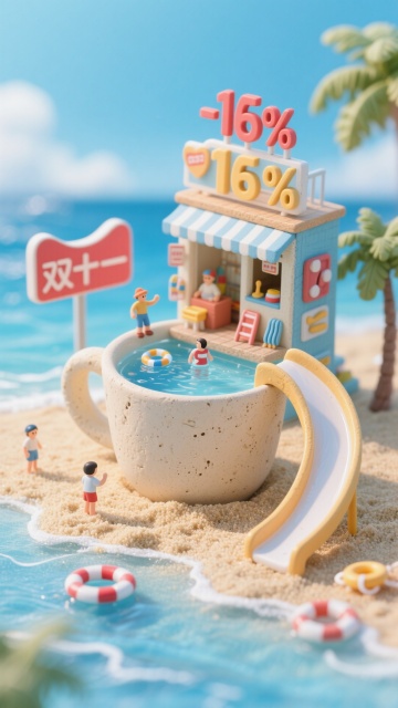 3D微缩艺术风,粘土质感的夏日海滩场景,咖啡杯变泳池,卡通人物环绕,超现实趣味感十足,融合促销元素与可爱设计,传递11.11购物狂欢氛围。