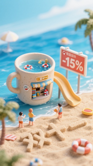 杯子,杯子右侧有滑滑梯,杯子里水面上是一个微缩世界。杯子开了一个口子,里面是一家游泳店铺,店铺招牌上写着“购物狂欢”,里面有游泳海边用具,粘土的质感。杯子摆在沙滩上,沙滩上有由沙子组成立体“11.11” ,一块醒目的广告牌,上面写了“-15%”