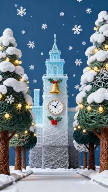 软3D风卡通雪屋,暖光透窗,彩条围巾点缀,鹿与雪橇营造温馨梦幻圣诞氛围。