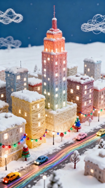 软3D风圣诞夜景,卡通感十足的雪镇冰场,圣诞老人与雪人共舞,彩灯闪烁,微缩艺术感满溢,喜庆温馨梦幻交织。