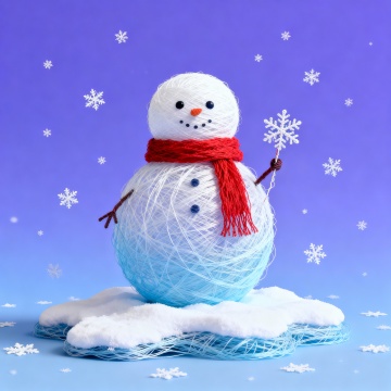 软3D风格雪人,毛线缠绕呈现面料质感,拟人化表情可爱生动,手持雪花营造梦幻温馨氛围,蓝色渐变背景点缀飘雪,节日趣味感十足。