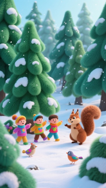 一片冬日森林场景,森林里有大量高大的松树,树上有积雪,一群小孩和松鼠手拉手在舞台上跳舞,有一只熊在前面唱歌,周边有小鸟在看