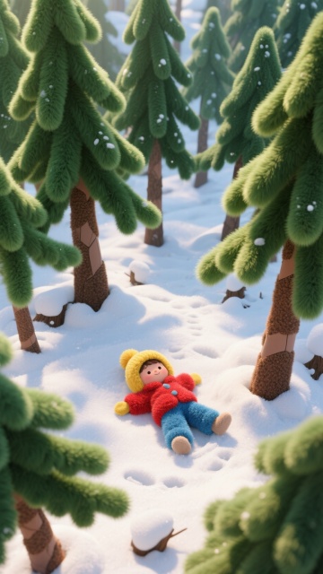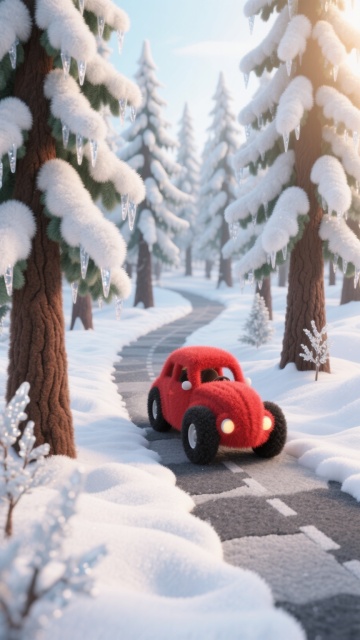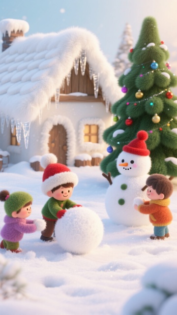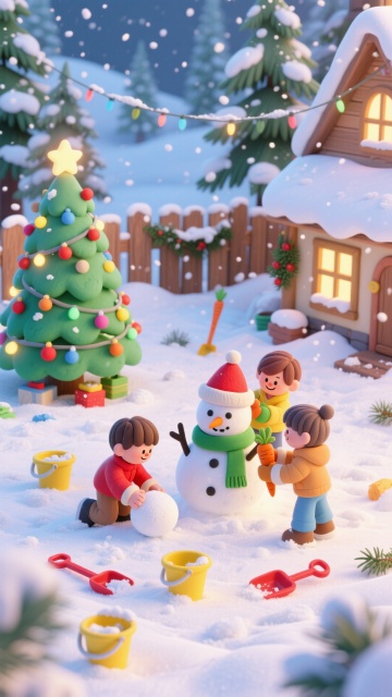 软3D风卡通雪屋,暖光透窗,彩条围巾点缀,鹿与雪橇营造温馨梦幻圣诞氛围。