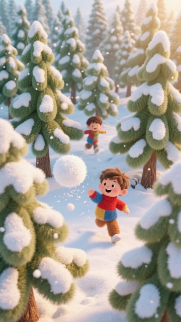梦幻雪境中的软3D童话世界,独角兽与小精灵相伴,彩虹桥、水晶树与彩灯点缀,水彩质感融合粒子光效,营造冬日节日的可爱卡通氛围。