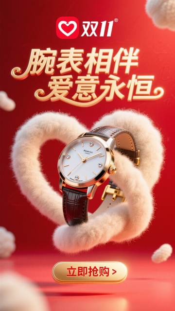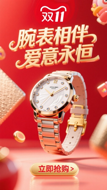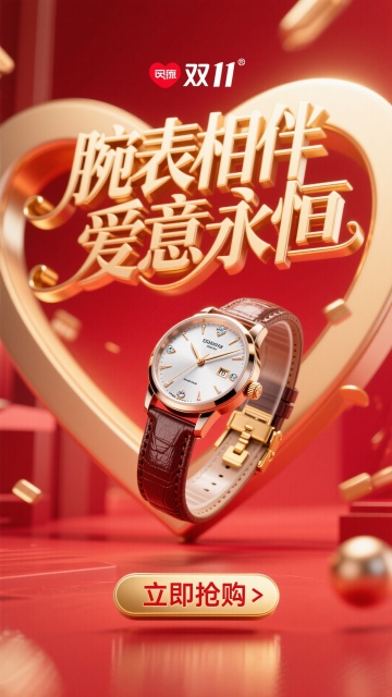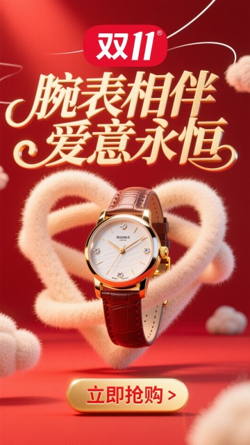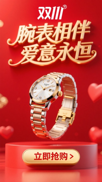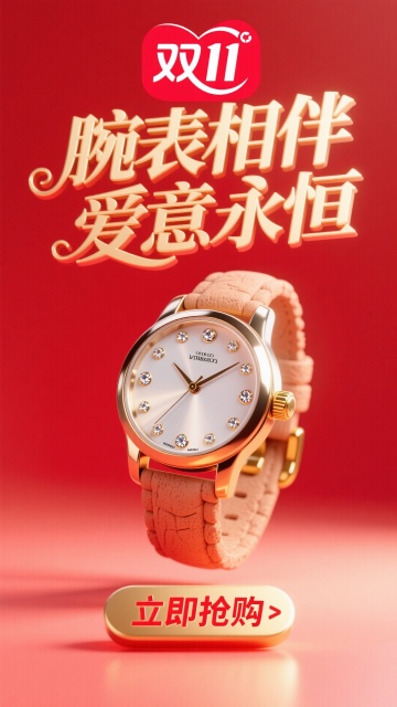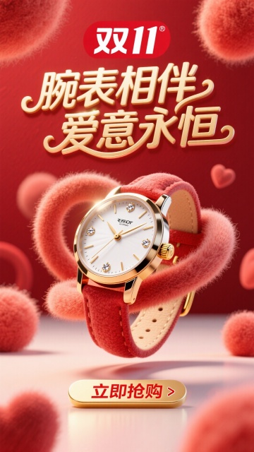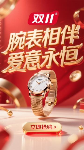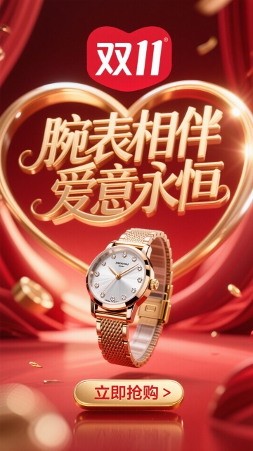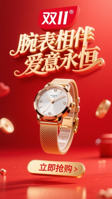 商业摄影风格,比例 16:9。以鲜艳的红色为背景,营造热烈氛围。画面正中央是巨大且优雅的主标题 “腕表相伴 爱意永恒”,采用金色立体艺术字体,笔画粗细变化富有韵律,表面有细腻的光泽质感,像是被柔和灯光照亮,凸显奢华与浪漫。标题上方显著位置为 “双 11” Logo,设计简约现代,以红色与白色为主色调,红色与背景呼应,白色线条勾勒出独特造型,醒目突出。画面核心的手表质感上乘,金属表身散发着冷冽光泽,表盘镶嵌着璀璨宝石,指针精准指向特定时刻,表带纹理清晰,与金色表扣相得益彰。画面底部的 “立即抢购” 按钮为醒目的金色,搭配红色文字,按钮具有强烈的立体效果,仿佛悬浮在背景之上,周围有一圈淡淡的红色光晕,吸引观者注意力,整体画面充满商业促销的活力与魅力。