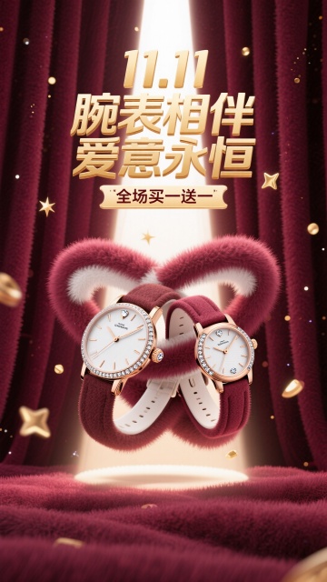 商业摄影风格,比例 16:9。以鲜艳的红色为背景,营造热烈氛围。画面正中央是巨大且优雅的主标题 “腕表相伴 爱意永恒”,采用金色立体艺术字体,笔画粗细变化富有韵律,表面有细腻的光泽质感,像是被柔和灯光照亮,凸显奢华与浪漫。标题上方显著位置为 “双 11” Logo,设计简约现代,以红色与白色为主色调,红色与背景呼应,白色线条勾勒出独特造型,醒目突出。画面核心的手表质感上乘,金属表身散发着冷冽光泽,表盘镶嵌着璀璨宝石,指针精准指向特定时刻,表带纹理清晰,与金色表扣相得益彰。画面底部的 “立即抢购” 按钮为醒目的金色,搭配红色文字,按钮具有强烈的立体效果,仿佛悬浮在背景之上,周围有一圈淡淡的红色光晕,吸引观者注意力,整体画面充满商业促销的活力与魅力。