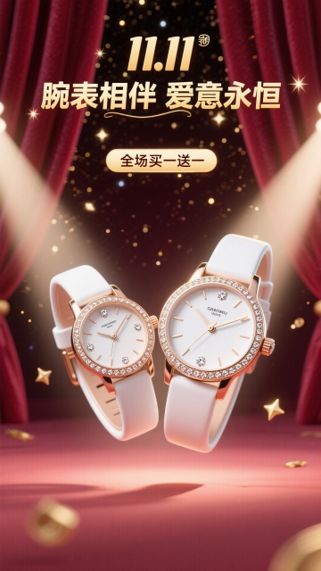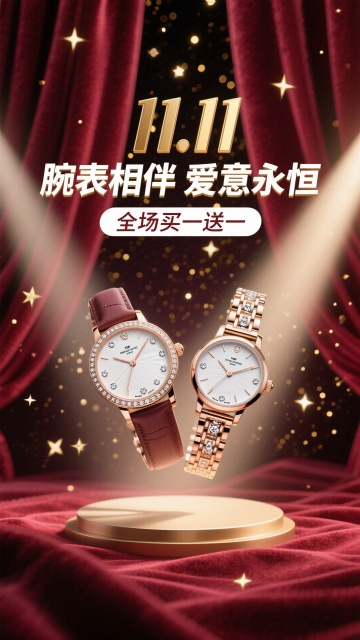 海报采用深邃的勃艮第酒红色背景,犹如天鹅绒幕布。画面中央,一道光束打下,聚焦于一对优雅交叉的男女款奢华腕表。表盘上的钻石与金属细节在光线下熠熠生辉,仿佛悬浮于璀璨星河之中。背景中若隐若现的金色光斑,如同繁星点点。 白色的“11.11”logo,巨大金色的主标题“腕表相伴 爱意永恒”,悬浮于手表上方,与副标题“全场买一送一”形成大小和字重的对比,整体感觉高端、浪漫且充满仪式感。