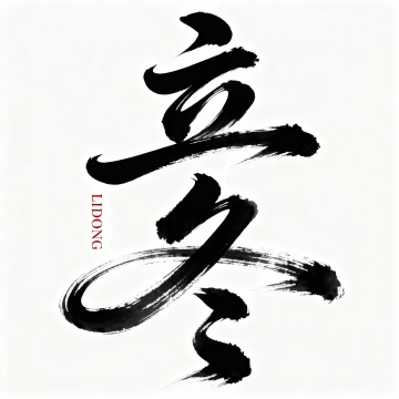中国传统节气水墨画风格,画面中央有“立冬”二字,字体为古朴的书法体,背景中点缀着飘落的雪花,远处有几枝光秃的树枝,墨色浓淡相宜,意境悠远宁静,留白恰到好处,展现冬日的萧瑟与静谧之美