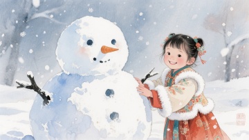 水彩风与工笔风交融,小女孩身着汉服堆雪人,拟人化的雪人笑容温暖,雪花纷飞中透出梦幻与温馨,尽显冬日童趣。