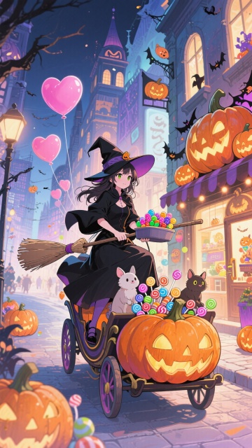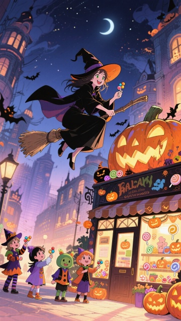 梦幻甜萌的万圣夜,巫师少女骑扫帚飞越糖果摊,心形气球与南瓜灯交织,插画风+拟人风+水彩质感,温馨又奇幻。