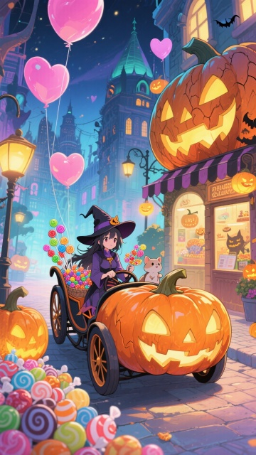 女巫坐着南瓜车载着小动物送糖果,南瓜造型的店铺,周围有南瓜灯、糖果等元素装饰,空中漂浮粉色爱心气球,背景是充满奇幻感的都市建筑,万圣节氛围