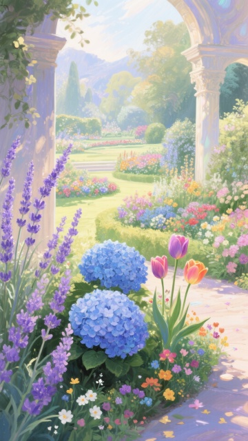 户外场景,印象派风格插画,广阔的薰衣草花田,远处是连绵起伏的紫色山丘,天空中飘着几朵蓬松的白云,阳光透过云层洒下柔和的光线,花田边缘点缀着几棵高大的风车,近处有一条蜿蜒的石板小路通向远方,空气中弥漫着淡淡的花香,整体色调以紫色和绿色为主,光影层次丰富,笔触细腻柔和,营造出宁静而浪漫的氛围