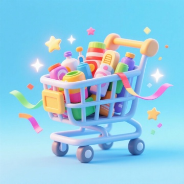 软3D风格购物车满载缤纷日用品,梦幻色彩搭配星光与彩带,营造清新可爱氛围,节日感十足。