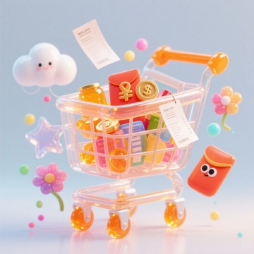 软3D风格购物车,充气质感搭配彩色购物袋与金币,波普艺术色彩碰撞,营造可爱卡通喜庆氛围。