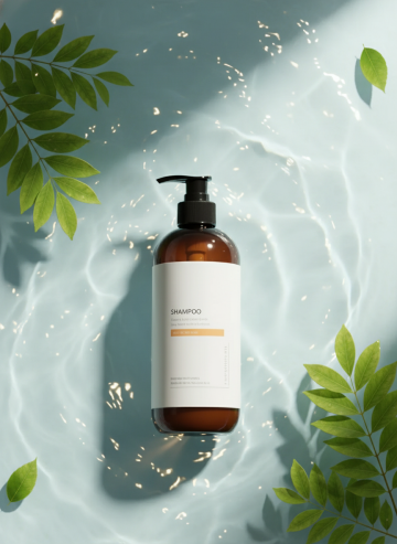 清新玻璃瓶置于虚拟自然水景中,花影轻舞,尽显清爽与清透感。