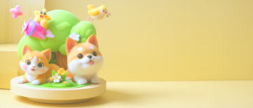 软3D风卡通场景,拟人化小女孩与萌犬共游花林,清新梦幻,趣味温馨,虚拟自然之美跃然眼前。