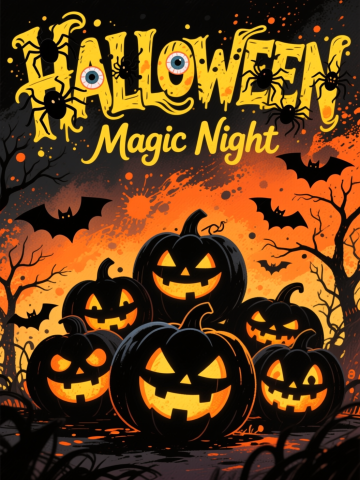 哥特风格与卡通感融合,插画风呈现惊悚又梦幻的万圣夜,大字风标题搭配蜘蛛眼元素,噪点与粒子效果营造神秘氛围。
