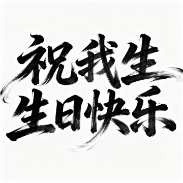 书法字体海报“祝我生日快乐”。草书字体狂野奔放,视觉张力富有动感,超粗笔画流畅飘逸,笔画巧妙延长变形,飞白效果,笔画流畅潇洒,干净背景,大师海报作品,电影海报