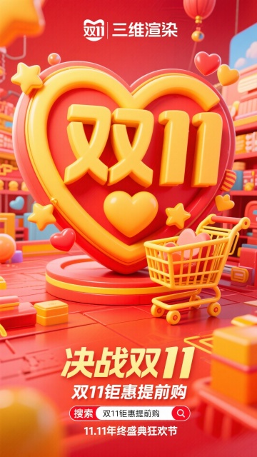 软3D风微缩艺术场景,卡通感十足的红色心形“双11”主视觉,搭配充气风购物车与塑料质感元素,营造喜庆热闹的促销氛围,传递双11狂欢节的可爱与活力。