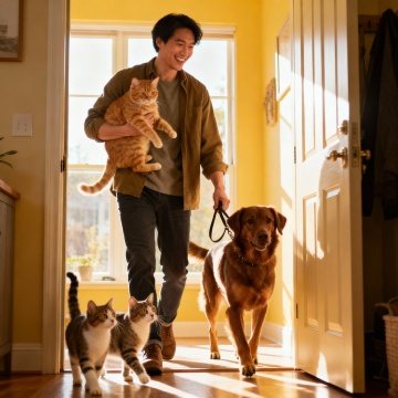温馨实景中,青年与萌宠共度时光,拟人化毛发生长细节增添柔软感,动漫风渲染舒适氛围,传递节日陪伴温情。