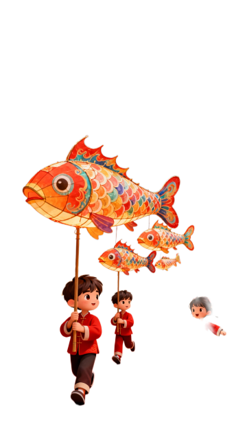 软3D风格的卡通锦鲤跃出水面,搭配鎏金“福”字与飘落的金币、枫叶,营造出喜庆梦幻的中式春节氛围,粒子光效点缀,尽显吉祥如意。