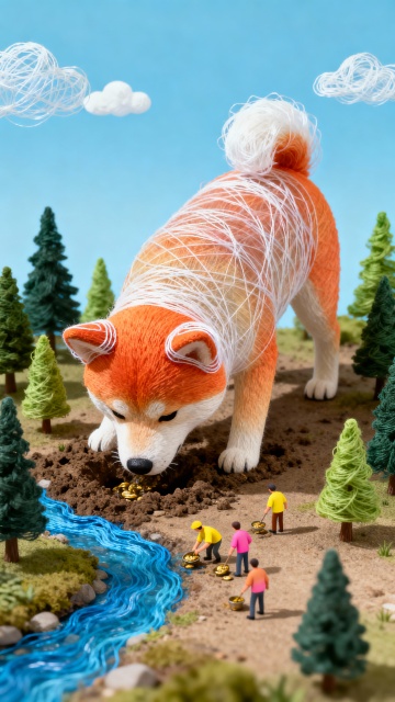 一只巨大秋田犬低头刨着一个淘金微缩场景,场上有松树,小河,地面上有一群小人在淘金,蓝天背景,俯视构图,动感,画面具有故事感,孟菲斯配色