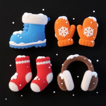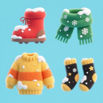 4个冬季素材组合,每个元素上都沾着积雪,分别是:一个黄色的毛绒裤子,一个粉色的兔子耳朵的毛毡帽子,一个深绿色有设计感元素的围巾,一个红色有设计感的靴子;元素上下两行整齐排列,纯色背景。
