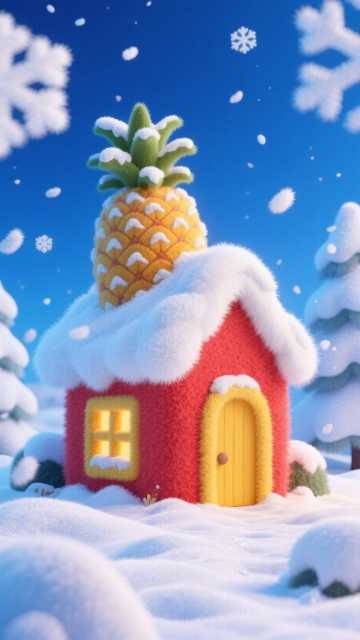画面中心是粉色的小木屋(白色门和窗),屋顶覆盖白雪,房顶上有一个巨大的被雪覆盖的葡萄串,黄色的天空,周边飘着白色雪花,地面有积雪