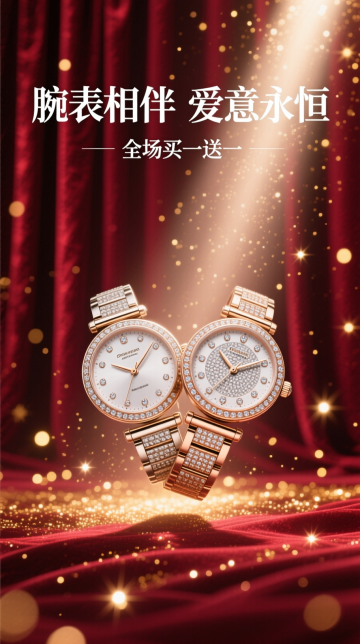 海报采用深邃的勃艮第酒红色背景,犹如天鹅绒幕布。画面中央,一道光束打下,聚焦于一对优雅交叉的男女款奢华腕表。表盘上的钻石与金属细节在光线下熠熠生辉,仿佛悬浮于璀璨星河之中。背景中若隐若现的金色光斑,如同繁星点点。 白色的“11.11”logo,巨大的主标题“腕表相伴 爱意永恒”,悬浮于手表上方,与副标题“全场买一送一”形成大小和字重的对比,整体感觉高端、浪漫且充满仪式感。