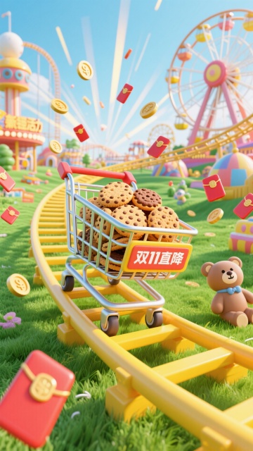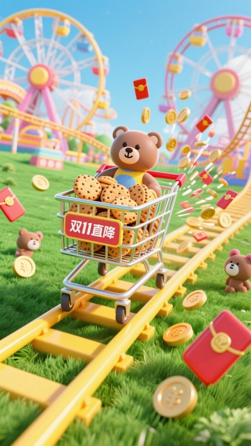 软3D风拟人小熊推购物车,满载饼干沿轨道飞驰,金币红包纷飞,游乐园背景梦幻喜庆,双11促销氛围十足,趣味感与可爱感爆棚。