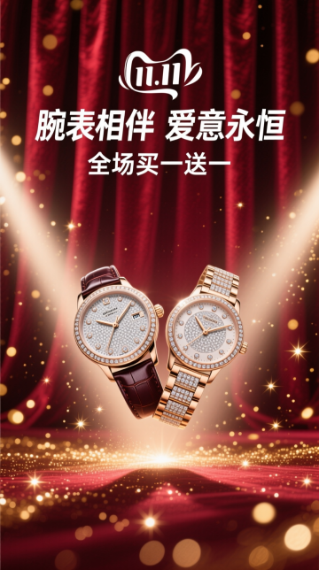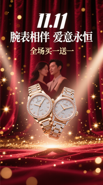 海报采用深邃的勃艮第酒红色背景,犹如天鹅绒幕布。画面中央,一道光束打下,聚焦于一对优雅交叉的男女款奢华腕表。表盘上的钻石与金属细节在光线下熠熠生辉,仿佛悬浮于璀璨星河之中。背景中若隐若现的金色光斑,如同繁星点点。 白色的“11.11”logo,巨大亮金色质量的主标题“腕表相伴 爱意永恒”,悬浮于手表上方,与副标题“全场买一送一”形成大小和字重的对比,整体感觉高端、浪漫且充满仪式感。