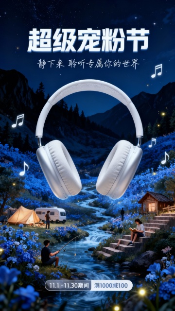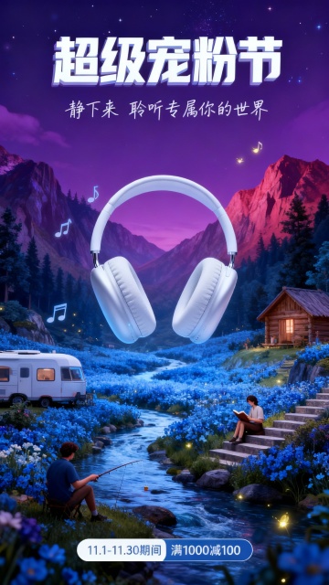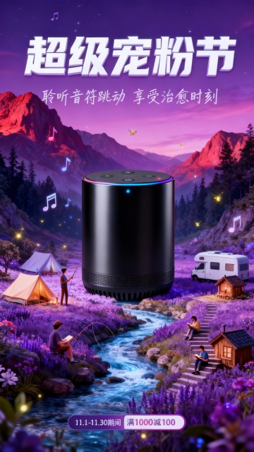 一个巨大的图中主体漂浮在暖黄色橙子海与溪流环绕的奇幻山谷中,周围有露营帐篷、房车、小木屋和人物在休闲娱乐,有人在搬运橙子,有人在吃橙子,空中飘着萤火虫,背景是粉色黄色渐变的山脉与森林,画面充满童话感与未来科技感,色彩梦幻,上方有白色主标题3D文字“超级宠粉节”,主标题下为手写白色副标题文字“与你共享 居家温馨时刻”,底部有折扣标签“11.1-11.30期间 满1000减100”,风格为超现实插画,3D渲染,细腻光影,治愈系氛围。