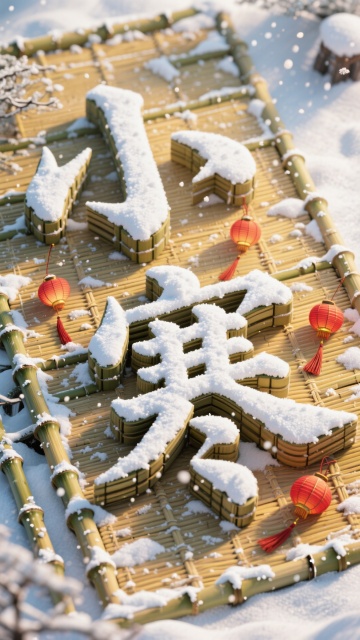 俯视视角,深棕青石板堆 “大雪” 积雪毛笔字,点缀冰糖葫芦,配色深棕 + 红白,背景有深红色廊亭,活泼显雪日趣味。