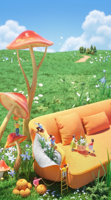 羊毛毡手工艺术的质感,借鉴了手作毛毡玩偶的蓬松肌理与温暖配色,还原出动物们软绒绒的触感; 微缩童话森林的场景设定,类似宜家“思克蒂瓦”系列的森林主题玩具,用巨型蘑菇、苔藓草地营造出缩小的奇幻自然空间; 治愈系萌系设计逻辑,结合了毛茸玩具的Q版造型+移轴摄影的微缩视角,让动物互动像真实存在的童话日常。