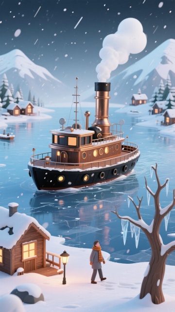 软3D风圣诞夜景,卡通感十足的雪镇冰场,圣诞老人与雪人共舞,彩灯闪烁,微缩艺术感满溢,喜庆温馨梦幻交织。