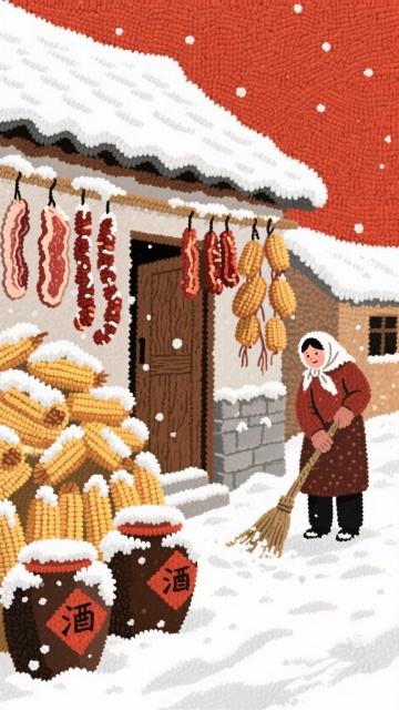 全景构图,主视觉是枣红马队拉着木质雪橇(挂红灯笼,覆雪),穿行于中式古镇。青瓦白墙覆雪,屋檐垂冰锥,窗透暖光,雪地行人提灯笼,右下角有披雪的梅枝。背景是灰白远山与墨蓝夜空,雪花轻飘,红棕 + 青白配色,古意盎然。