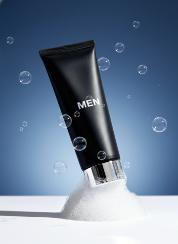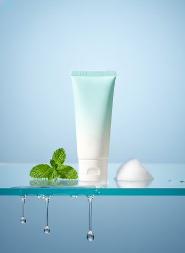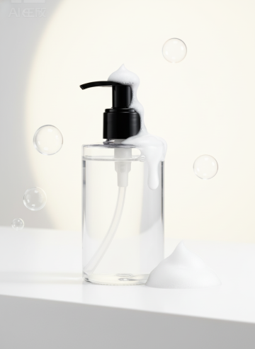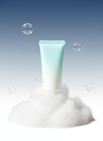 产品竖立在青色台面上,旁边和顶部各有一团白色泡沫,增添清洁感,周围有漂浮的泡泡,背景为抽象的淡绿色和蓝色弧形几何光影,营造高级质感。柔和光线,摄影级写实效果,高端护肤产品广告风格,极简设计,现代美学,高清细节。