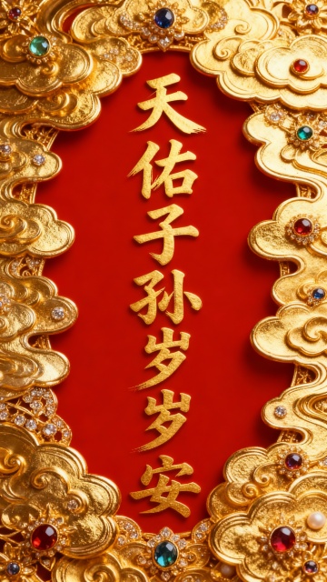 一张以深黑色毛绒材质为背景的中国传统刺绣风格海报,毛绒质感细腻柔软,带有自然的光泽和纹理。画面中央是一只色彩华丽的刺绣凤凰,主体羽毛以鲜艳的红色和金色为主色调,点缀翠绿和宝蓝色的细节,凤凰昂首展翅,姿态优雅灵动,周围环绕着祥云和牡丹刺绣图案。海报中央下方是金色立体刺绣的“福至”二字,字体饱满有力,带有传统书法韵味,“福”字周围装饰有回纹和如意纹刺绣边框。左侧竖排绣有金色文字“愿生活如诗如画,岁月温暖常伴”,右侧竖排绣有绿色文字“平安喜乐,万事顺遂”,文字采用优雅的宋体刺绣,边缘有细致的描金。底部中央绣有英文“PEACE AND JOY”,字体流畅飘逸,整体排版遵循传统中式海报的对称美学,视觉层次分明,刺绣图案与毛绒背景形成鲜明对比,营造出喜庆、吉祥且富有高级质感的氛围,所有元素均以精致的刺绣工艺呈现,针脚细密,色彩过渡自然,充满浓厚的传统手工艺气息。