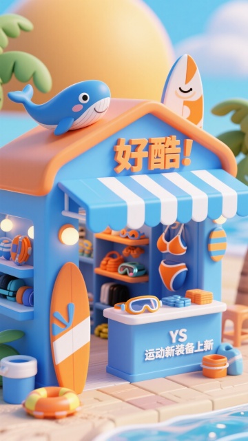 软3D风微缩艺术场景,卡通感十足的海滩小店,搭配可爱鲸鱼与冲浪板,清爽梦幻,传递夏日趣味与清新活力。