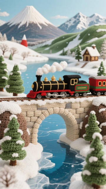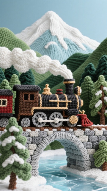 以白色粗毛线塑造雪地与河流景观,点缀滑雪小人、雪人、枯树、松果,冬日氛围