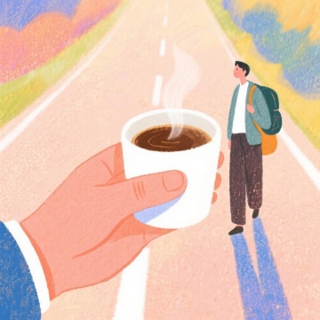 梦幻插画风,剪影人物与水彩背景交织,超现实主义展现书页幻化为山川景象。