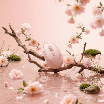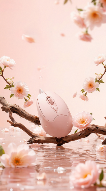 3D玻璃风雪景球内悬浮粉色暖手宝,樱花粒子轻舞,搭配红灯笼与福字贴,柔美喜庆,传递甜美节日氛围。