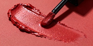 参考图中的正红色口红巨大化撕开铺面全屏的杂志封面,口红从裂缝中探出,上方杂志标题“LIPSTICK”,下方小标题“保湿滋润口红”。