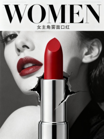 杂志风封面设计,撕纸效果突出金属质感口红,黑白对比强化时尚与奢华,演绎优雅女主魅力。