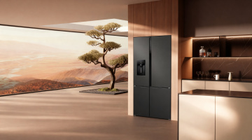 现代简约风格,3D实景渲染,金属质感冰箱搭配温馨家居场景,重拟物设计突出科技与舒适感,双12促销氛围浓厚。